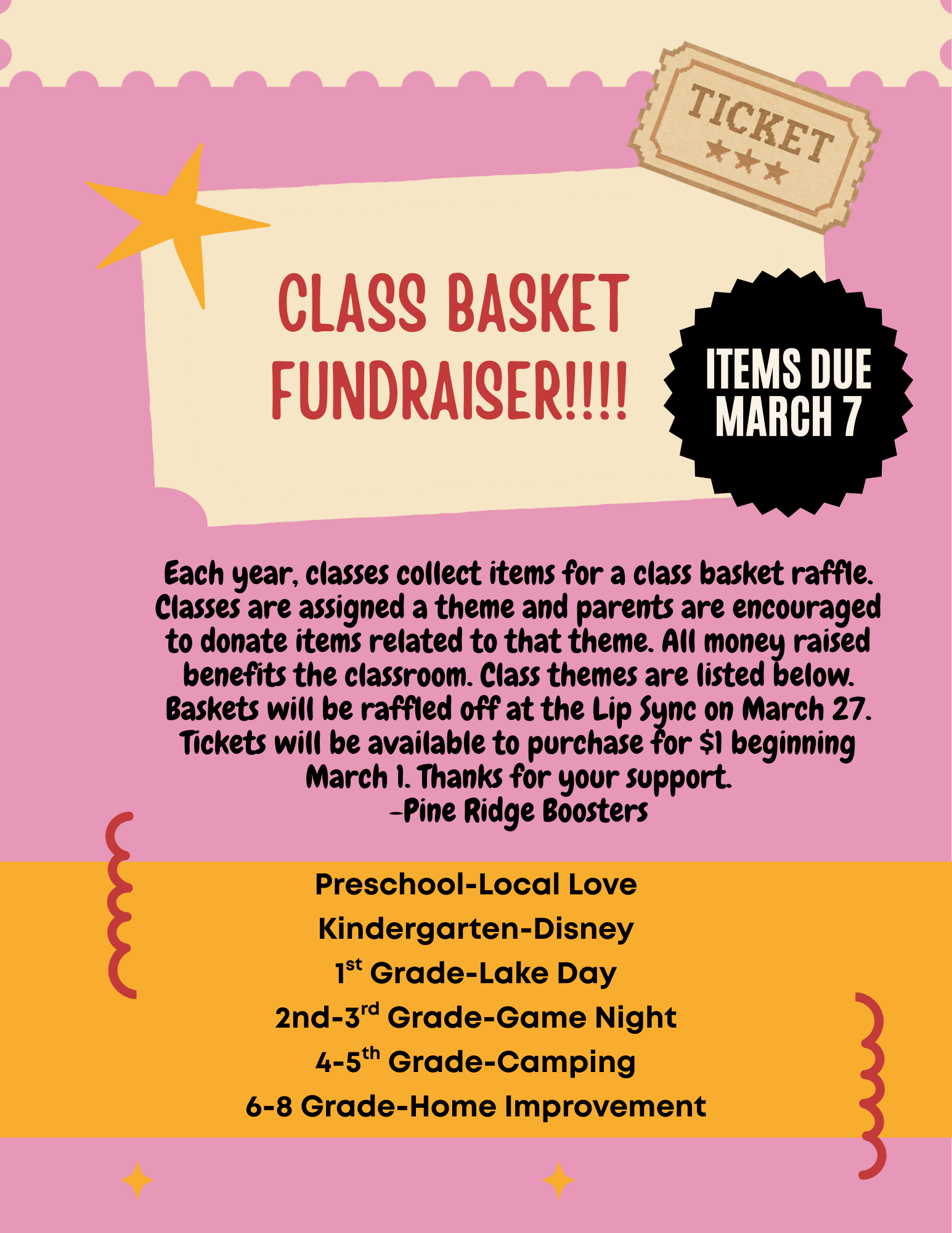 We will be raffling off these class baskets during our LipSync Program on March 27. Each class has a theme and is asking for donations to fill these baskets. A detailed flyer is attached. Thank you:)